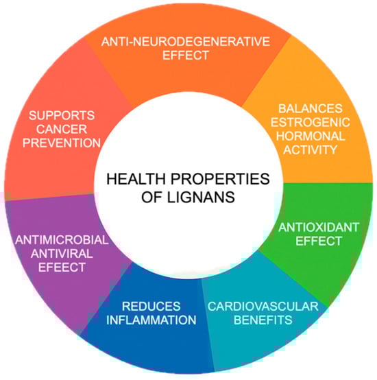 - Jang, W.Y.; Kim, M.-Y.; Cho, J.Y. Antioxidant, Anti-Inflammatory, Anti-Menopausal, and Anti-Cancer Effects of Lignans and Their Metabolites. Int. J. Mol. Sci. 2022, 23, 15482. [Google Scholar] [CrossRef]