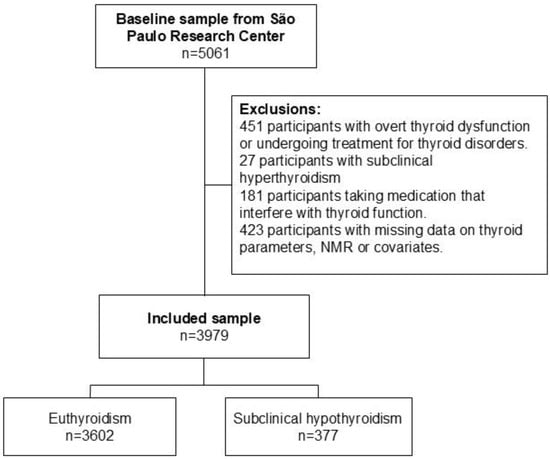 This is a cross-sectional design study using the baseline data of the Brazilian Longitudinal Study of Adult Health (ELSA-Brasil). The ELSA-Brasil represents a large-scale, multicenter, and prospective cohort investigation that has tracked a cohort of middle-aged and older adults residing in 6 state capitals in Brazil [,]. The study protocol was standardized and approved in the Ethics Board Committees of all research centres, and individual written consent was obtained from all study participants (Plataforma Brasil CAAE number 08109612.7.1001.0076). The study was conducted in accordance with the Declaration of Helsinki as revised in 2013. The baseline data collection phase (2008–2010) encompassed a comprehensive health evaluation, involving an array of laboratory assays and medical imaging procedures [,,,,]. Active and retired civil servants (ranging from 35 to 74 years) were eligible to take part in the study. In this particular analysis, we focused on the subset of participants from the São Paulo research centre of ELSA-Brasil (n = 5061), for whom Nuclear Magnetic Resonance (NMR) data was available at the study’s baseline. Contrary to the notion that the cohort originates from a single deprived community, ELSA-Brasil recruits public servants from universities, research institutes, and healthcare facilities. Consequently, the São Paulo research centre includes individuals from diverse neighbourhoods and socioeconomic backgrounds within the metropolitan area. After applying some exclusion criteria (Figure 1), such as 451 participants with clinical thyroid diseases or taking levothyroxine, propylthiouracil, and thiamazole for the sample, 27 participants with subclinical hyperthyroidism, 181 participants using medications that can alter thyroid function (amiodarone, carbamazepine, carbidopa, furosemide, haloperidol, heparin, levodopa, lithium, metoclopramide, phenytoin, propranolol, primidone, rifampicin, valproic acid, and systemic steroids), and 423 participants with missing data on thyroid or NMR parameters or covariates, the final sample comprised 3979 individuals. There were no systematic differences between participants that were excluded due to missing data (n = 423) from the included sample (n = 3979) (Supplementary Table S1).