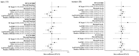 Subgroup analyses using sex-stratified data showed positive associations of TSH with MVX and IVX scores and an inverse association of lnFT3 with MVX, MMX, and IVX scores only for men (Figure 2A). There was no significant association between thyroid-related parameters and MVX, MMX, and IVX scores for women (Figure 2B).