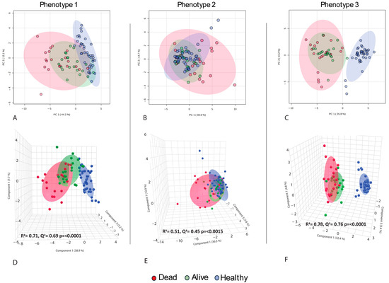 Figure 1. (AC): PCA demonstrates the differentiation of the three cohorts based on phenotypes 1 to 3. (DF): The PLS-DA using metabolic phenotypes highlights distinct changes in metabolites across the cohorts based on phenotypes 1–3. The models showed Phenotype 1: R2 = 0.71, Q2 = 0.69; Phenotype 2: R2 = 0.51, Q2 = 0.45; Phenotype 3: R2 = 0.78, Q2 = 0.76. Predictive ability is high for Phenotypes 1 and 3 (Q2 > 0.6) and moderate for Phenotype 2. The close agreement of R2 and Q2 suggests no evident overfitting.