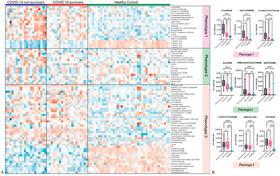Figure 2. Heatmap analysis illustrates the metabolite variations associated with different metabolic phenotypes across three groups: COVID-19 non-survivors, COVID-19 survivors, and healthy controls (A). Examples of metabolites related to each metabolic phenotype are shown (B). Statistical significance was determined using. * p < 0.05; ** p < 0.01; *** p < 0.001; **** p < 0.0001; ns: non significant.