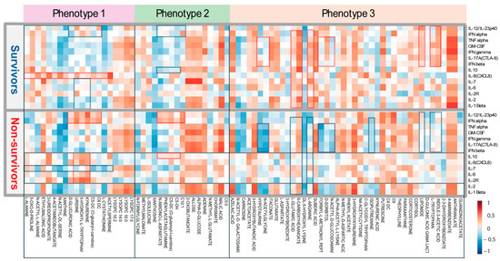 Figure 3. Correlation analysis reveals the correlation coefficients between metabolites from three metabolic phenotypes and 14 cytokines of COVID-19 survivors and non-survivors. The figure highlights significant differences in metabolite-cytokine correlations between the non-survivor and survivor cohorts. Key differences are marked by red rectangles (indicating higher correlations) and blue rectangles (indicating lower correlations).