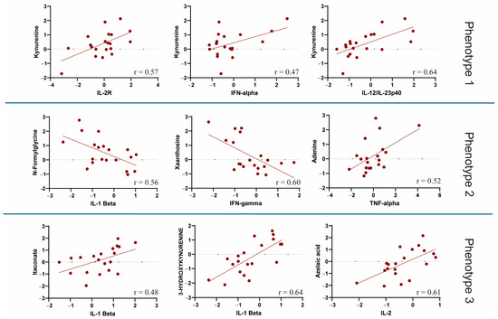 An overview of the correlation between all metabolites and cytokines is available in the Supplementary (Figure S3). Regarding metabolic phenotype 1, the relationship between kynurenine and various cytokines differed between survivors and non-survivors. Kynurenine was strongly correlated with IL-10, IL-8, IL-7, IL-6, IL-2R, IL-12, and IFN-α levels in patients with COVID-19. In particular, IL-12 and IFN-α were more strongly related to L-cystathionine, kynurenine, 5-hydroxy-L-tryptophan, uridine, and D-glucuronic acid in non-survivors. In addition, nearly all metabolites of phenotype 1 were positively correlated with IL-8 levels among survivors (Figure 3). The results showed that IL-1β, IL-2, IFN-β, IFN-γ, IL-17, GM-CSF, and TFN-α had a slightly higher correlation with metabolic phenotype 2 in non-survivors, indicating a potential association with COVID-19 mortality outcome. For metabolic phenotype 2, C10, C5OH, phenylacetylglutamine, and N-amidino-L-aspartate showed higher correlation coefficients with IL-12 and IFN-α in non-survivors; however, methyl malonate showed a stronger cytokine correlation in survivors (Figure 3). Further analysis showed an overall lower correlation between the cytokines IL-2R, IL-6, IL-7, IL-8, and IL-10 and metabolic phenotype 3 among non-survivors, indicating a lower association of these cytokines with COVID-19-related metabolites. In metabolic phenotype 3, L-arginine, 6-carboxyhexanoate, and L-glutamic acid showed lower cytokine correlation coefficients among non-survivors. In general, a few metabolites were strongly associated with IL-12, IFN-γ, TNF-α, GM-CSF, IFN-β, and IFN-α in the survivors (Figure 3). Figure 4 shows some key examples of important metabolite-cytokine correlations (p < 0.05) that appeared almost entirely within non-survivors, except for the itaconate and IL-1β correlations, which were significant in survivors. A significant (p < 0.05) correlation among metabolites within metabolic phenotypes between non-survivors and survivors is shown in Figure S4.
