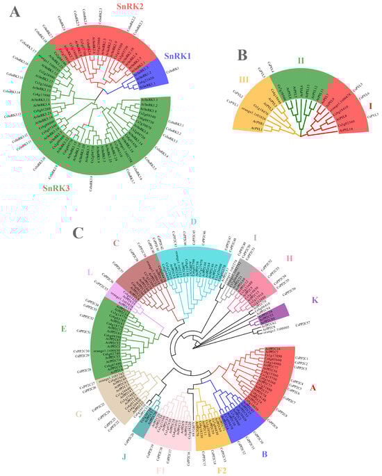 3.1. Identification and Classification of CsSnRK, CsPYL, and CsPP2C Gene Families in Citrus sinensis