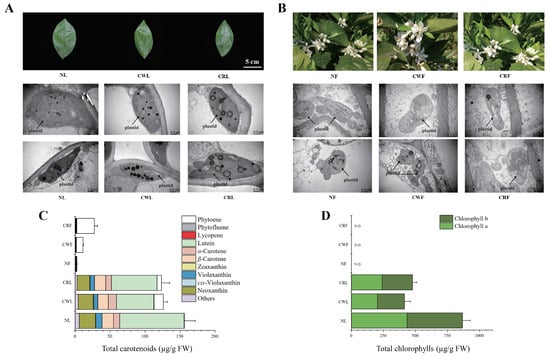 3.2. Comparative Profiling Reveals ‘Cara Cara’ Juice Vesicles Hyperaccumulate Linear Carotenoids (Phytoene, Phytofluene, and Lycopene) over ‘Newhall’, with Parallel Leaf/Flower Phytoene Elevation and Supporting Plastid Ultrastructure