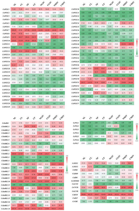 | CsSnRK2.1; CsSnRK3.3; CsSnRK3.4; CsSnRK3.7; CsSnRK3.15 | NF/NL≥2 and CF/CL≥2 | CsSnRK2.4; CsSnRK3.7 | NGJV/NL≥2 and CGJV/CL≥2 | CsSnRK3.6; CsSnRK3.7 | NMJV/NL≥2 and CMJV/CL≥2 |