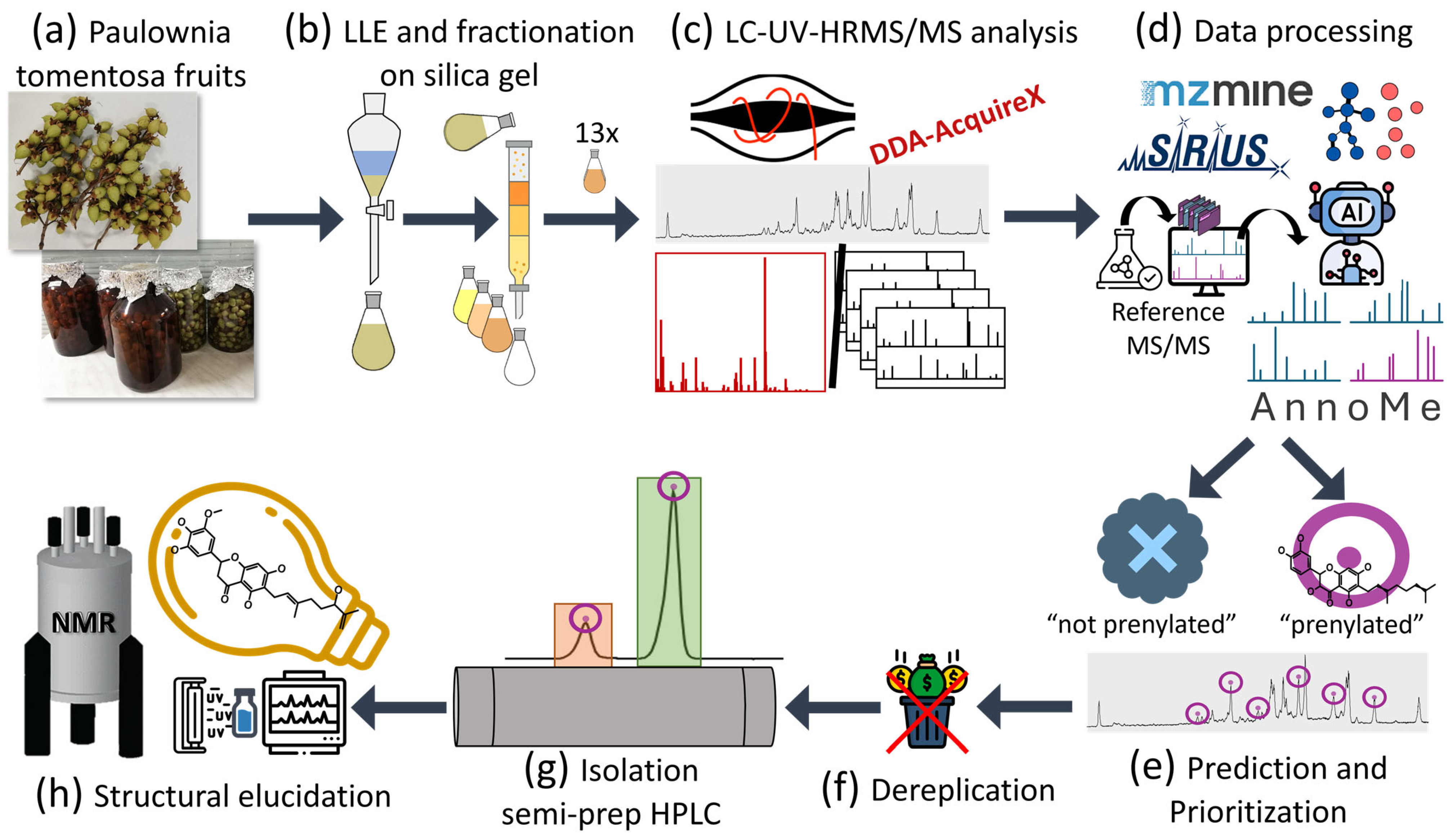 Rypar, T.; Molcanova, L.; Valkova, B.; Hromadkova, E.; Bueschl, C.; Seidl, B.; Smejkal, K.; Schuhmacher, R. Targeted Isolation of Prenylated Flavonoids from Paulownia tomentosa Fruit Extracts via AI-Guided Workflow Integrating LC-UV-HRMS/MS. Metabolites 2025, 15, 616. https://doi.org/10.3390/metabo15090616