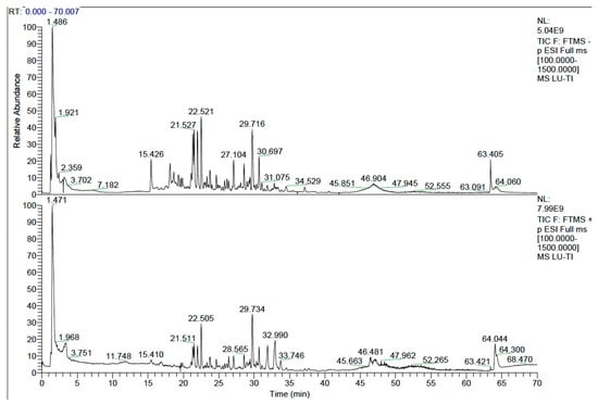 Total ion chromatograms (TIC) of active compounds in YGS extract detected by UPLC-MS/MS. The upper panel shows the TIC in negative ion mode, and the lower panel shows the TIC in positive ion mode.