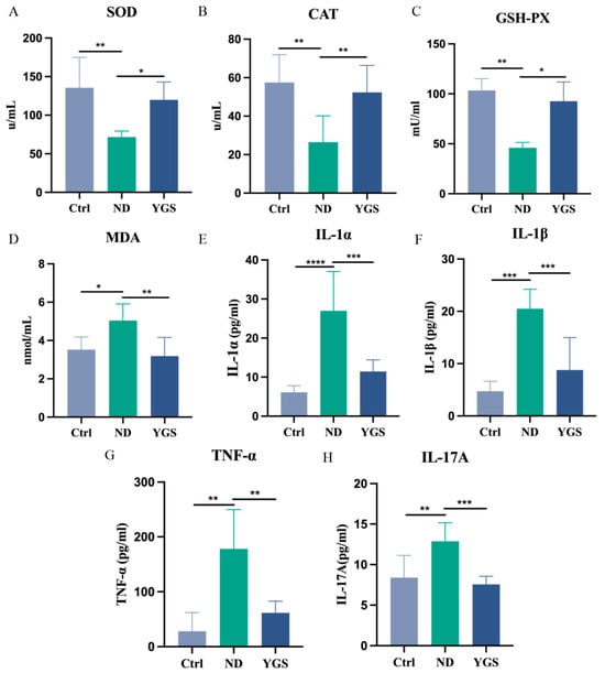 Effects of YGS treatment on serum oxidative stress indicators and pro-inflammatory cytokines in diarrheic calves. (A) Superoxide dismutase (SOD), (B) Catalase (CAT), (C) Glutathione Peroxidase (GSH-PX), (D) Malondialdehyde (MDA), (E) Interleukin-1α (IL-1α), (F) Interleukin-1β (IL-1β), (G) Tumor necrosis factor-α (TNF-α), (H) Interleukin-17A (IL-17A). Ctrl: healthy control group; ND: natural diarrhea group; YGS: YGS treatment group. The data is presented as mean ± SD (n = 7). * p < 0.05, ** p < 0.01, *** p < 0.001, **** p < 0.0001.