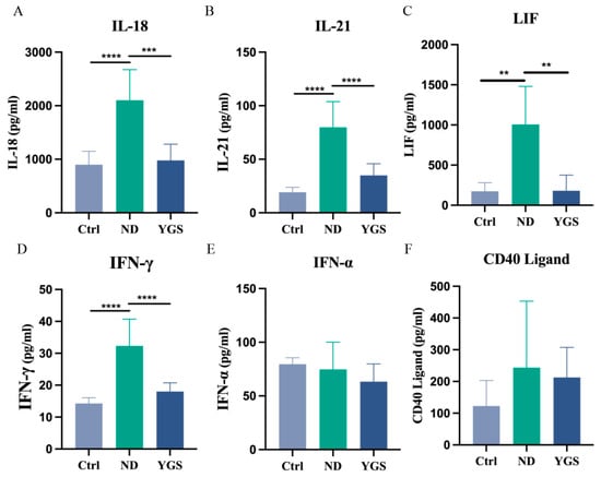 Effects of YGS treatment on serum pro-inflammatory cytokines in diarrheic calves. (A) Interleukin-18 (IL-18), (B) Interleukin-21 (IL-21), (C) Leukemia Inhibitory Factor (LIF), (D) Interferon-γ (IFN-γ), (E) Interferon-α (IFN-α), (F) CD40 Ligand. Ctrl: healthy control group; ND: natural diarrhea group; YGS: YGS treatment group. The data is presented as mean ± SD (n = 7). ** p < 0.01, *** p < 0.001, **** p < 0.0001.