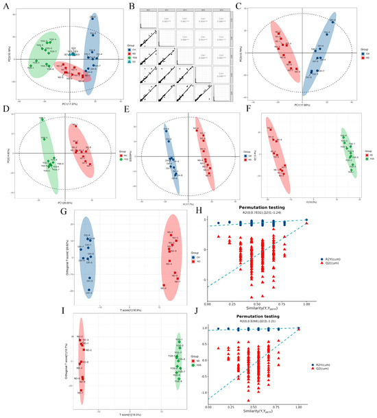 PCA, partial least squares-discriminant analysis (PLS-DA), and Orthogonal PLS-DA (OPLS-DA) were employed to assess inter-group metabolic differences. Pronounced clustering of diarrheic calves versus controls in score plots (Figure 5C−J) evidenced significant endogenous metabolite reorganization during calf diarrhea.