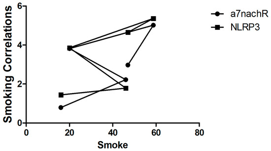 In our correlation analysis based on group averages, rather than individual data, no correlation was found between smoking rates and α7nAChR and NLRP3 levels (p > 0.05) (Figure 1).