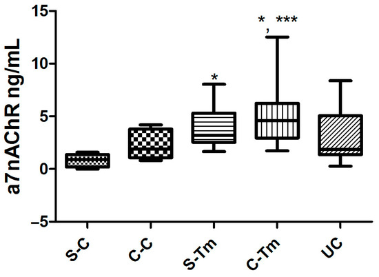 There were significant differences in α7nAChR levels [F = 6.009, p = 0.0006]. Post hoc comparisons using the Tukey HSD test revealed that α7nAChR levels were significantly higher in the S-Tm and C-Tm groups (p < 0.05) than in the S-C group (p < 0.001). There were also significant increases in the C-Tm group compared to the C-C group (p < 0.05). There were no significant differences between the other experimental groups (p > 0.05) (Figure 2).