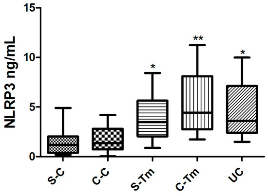 There were significant differences in levels of NLRP3 [F = 5.603, p = 0.0010]. In post hoc comparisons using the Tukey HSD test, statistically significant discrepancies in NRLP3 levels were identified between the UC and C-Tm groups (p < 0.05), as well as between the S-C and C-Tm groups (p < 0.01). Moreover, a substantial discrepancy in NRLP3 levels was evident between the C-C and C-Tm groups (p < 0.01) (Figure 3).