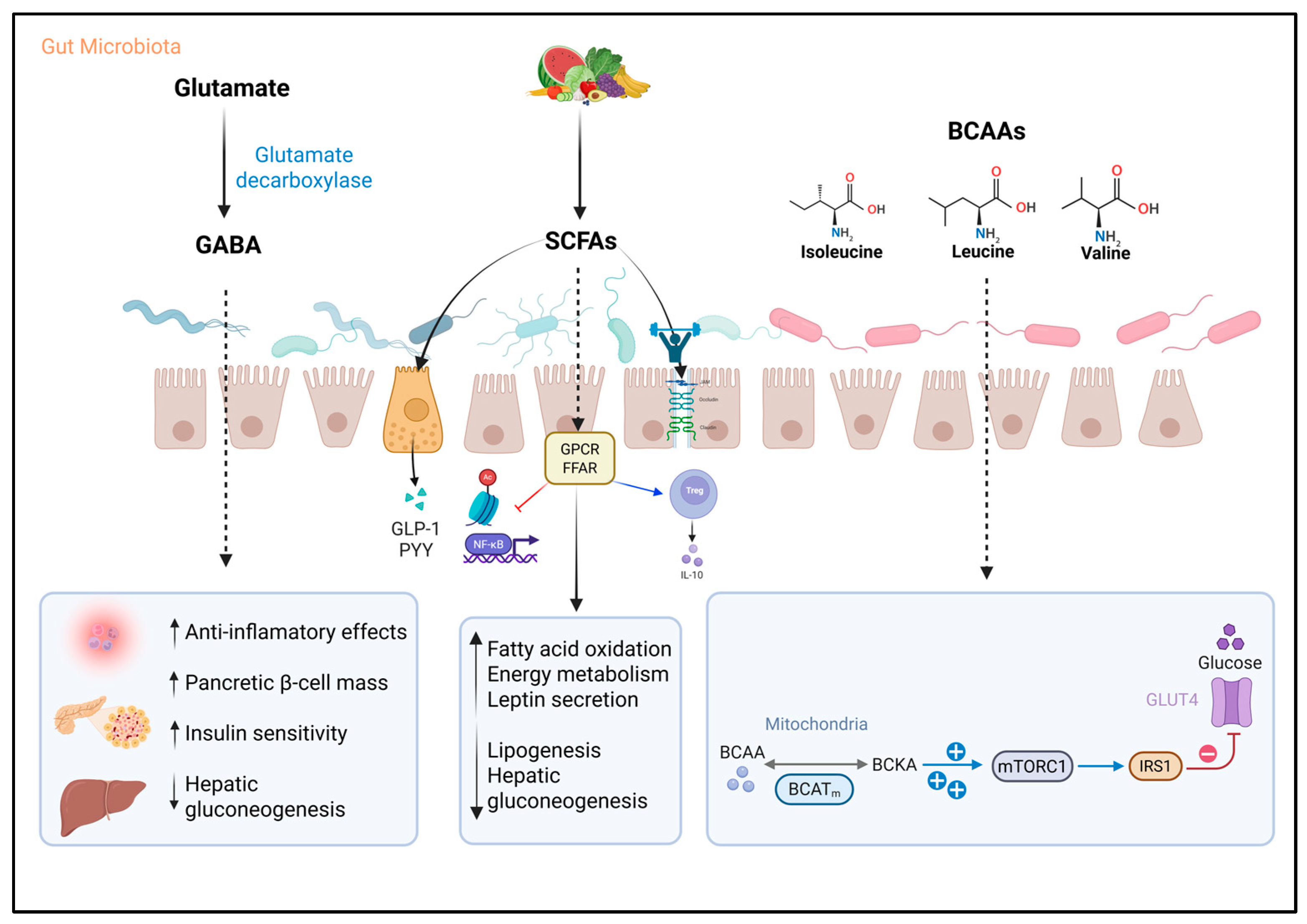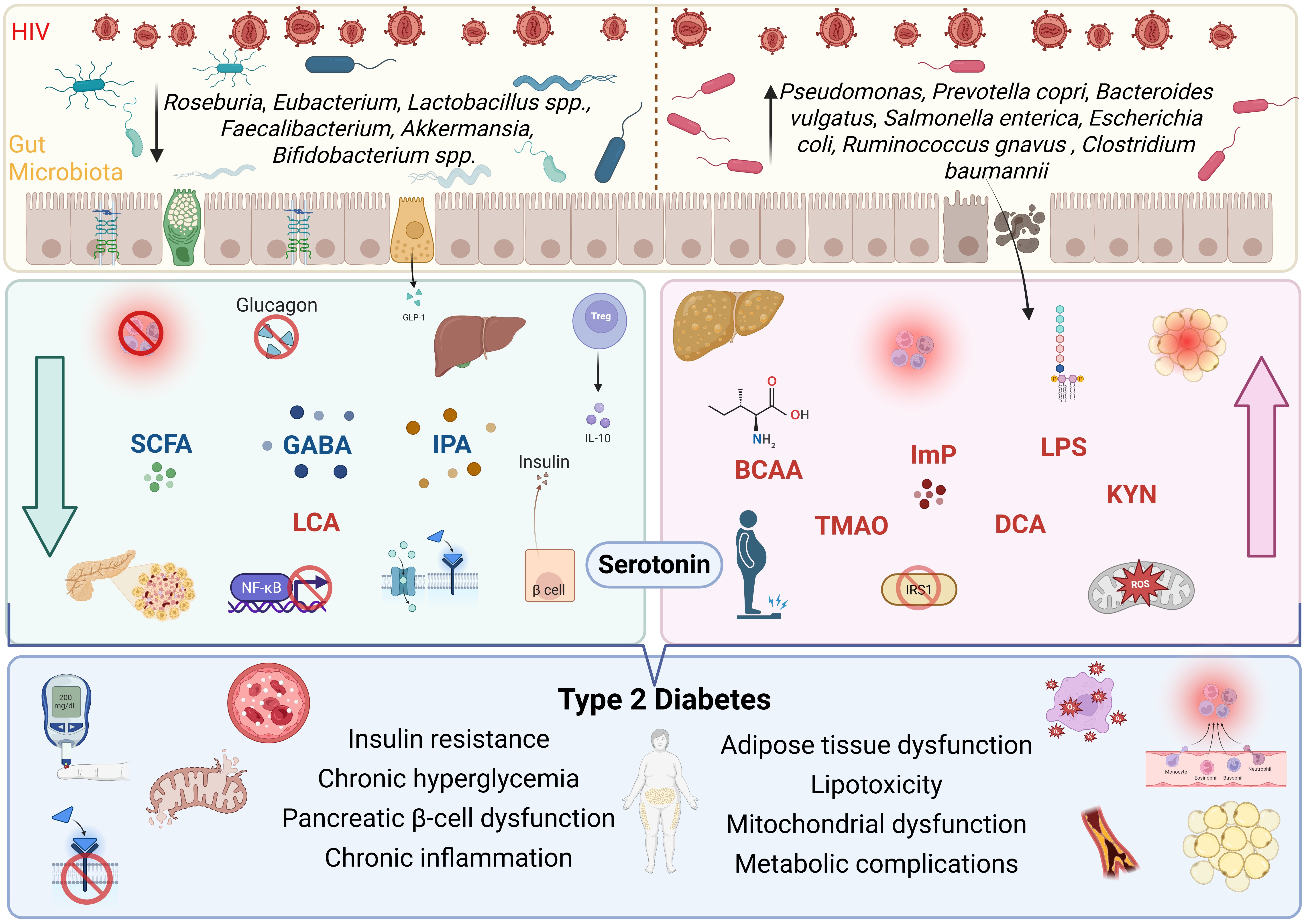 GABA | Escherichia coli, Listeria monocytogenes, Bifidobacterium spp., Bacteroides spp., and lactic acid bacteria like Lactobacillus, Lactococcus, and Streptococcus | Acts on specific type A receptors, modulating glucose-induced insulin secretion. Activates the PI3K/AKT pathway, enhancing IRS1 and GLUT4 expression | Exhibits anti-inflammatory effects. HIV is associated with reduced abundance of GABA-producing intestinal bacteria | Increase insulin sensitivity and secretion. Reduces hepatic glucose production and lipid accumulation |