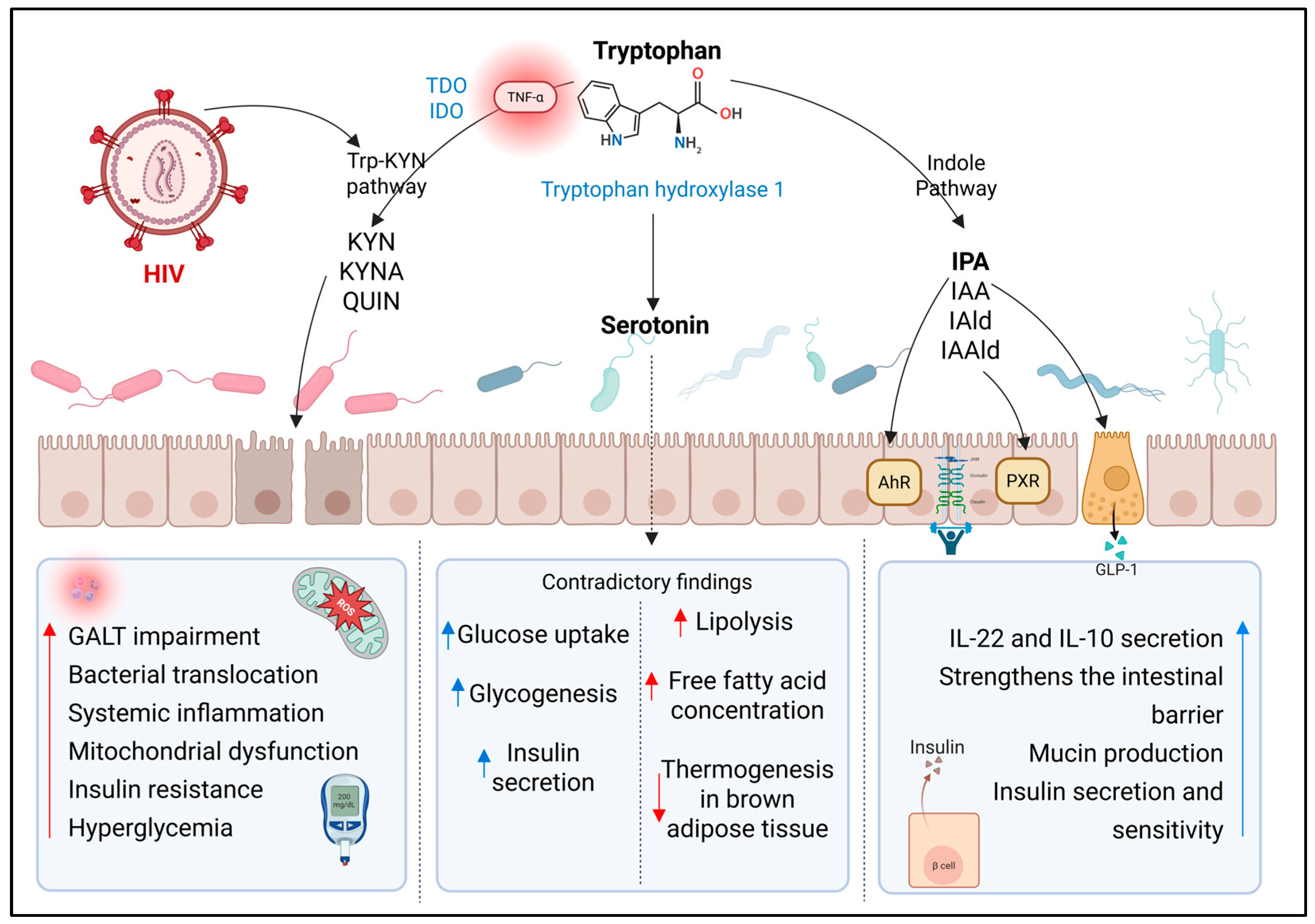 Kynurenine pathway-derived metabolites | Pseudomonas, Xanthomonas, Burkholderia, Stenotrophomonas, and Shewanella, and members of the genus Bacillus | Multiple pathways promoting oxidative stress, chronic immune activation, and inflammation | Associated with disease progression, CD4+ T cell depletion, and systemic immune dysfunction. An imbalance between Th17 and Treg cells exacerbates immunosuppression and intestinal epithelial damage | Linked to increased IR through chronic low-grade inflammation, oxidative stress, and decreased tryptophan availability for the synthesis of protective metabolites |
