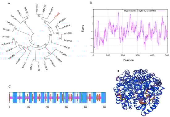 Analysis of the basic characteristics of FsTyDC1. (A) Phylogenetic tree of FsTyDC1 in F. suspensa (the bootstrap scores (1000 replicates) are shown (≥50%) for each branch). (B) Conserved domain analysis of the FsTyDC1 protein. (B) Hydrophobicity/hydrophilicity analysis of the FsTyDC1 protein. (C) Secondary structure prediction of the FsTyDC1 protein. (D) Three-dimensional structure prediction of the FsTyDC1 protein. (Note: RgTyDC: Rehmannia glutinosa TyDC, FsTyDC: Forsythia suspensa TyDC, PsTyDC: Papaver somn; iferum TyDC, LaTyDC: Lycoris aurea TyDC, PcTyDC: Petroselinum crispum TyDC, StTyDC: Solanum tuber; osum TyDC, SbTyDC: Sorghum bicolor TyDC, StTyDC: Solanum tuberosum TyDC, AtTyDC: Arabidopsis; thaliana TyDC, MdTyDC: Malus domestica TyDC, NtTyDC: Nicotiana tabacum TyDC, OeTyDC: Olea europaea TyDC, CaTyDC: Camptotheca acuminate TyDC, CrTyDC: Catharanthus roseus TyDC, VwTyDC: Viola×wittrockiana TyDC, RcTyDC: Rhodiola crenulate TyDC, RsTyDC: Rhodiola sachalinensis TyDC).