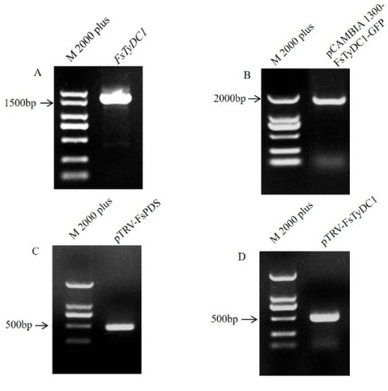 The target fragments of FsTyDC1 were amplified using PCR and examined using 1% agarose gel electrophoresis (Figure 2A). Sequence analysis confirmed that the cDNA sequence of the FsTyDC1 was 1518 bp in length (GenBank No. OR725691). The pCAMBIA 1300-FsTyDC1-GFP (Figure 2B) recombinant expression vector and pTRV2-FsPDS/FsTyDC1 vector (Figure 2C,D) were constructed and transferred into Agrobacterium sensu lato GV3101 and set aside for further use.