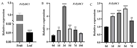 Expression analysis of FsTyDC1 in different periods and tissues of F. suspensa. (A) Expression of FsTyDC1 in leaves and fruits of F. suspensa. (B) Expression of FsTyDC1 in different drought treatment times with 400 mmol/L mannitol. The expression of the FsTyDC1 gene was extremely significant after 3 days of drought treatment. (C) Expression of FsTyDC1 in different salt treatment times with 200 mmol/L NaCl. The expression of the FsTyDC1 gene was extremely significant after 1, 3, and 5 days of salt treatment (Note: ** stands for p < 0.01, *** stands for p < 0.001, **** stands for p < 0.0001).