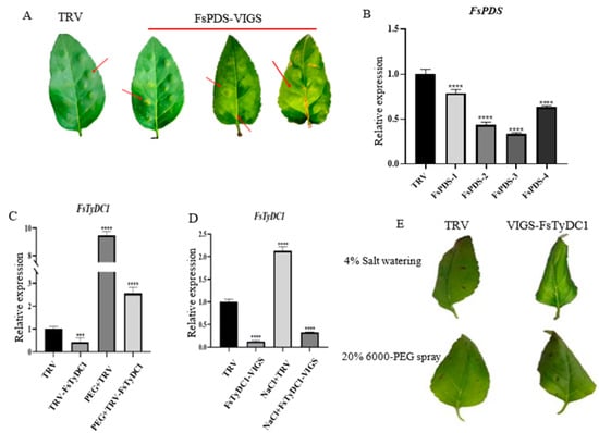 Establishment of the FsPDS silencing system and analysis of VIGS-FsTyDC1 F. suspensa under drought and salt stresses. (A) Phenotypic changes in F. suspensa leaves treated with FsPDS-VIGS. The leaf surface was bleached near the pinhole injection, but there was no bleaching near the vacuum of the unloaded blade. The VIGS-FsPDS silencing system can play a normal silencing role in F. suspensa leaves. (B) FsPDS expression of leaves in F. suspensa after FsPDS-VIGS silencing. TRV was the control. FsPDS-1, FsPDS-2, FsPDS-3 and FsPDS-4 represented different silenced leaves, respectively. Compared with the control group, the relative expression of the FsPDS gene in photobleached plants decreased. (C) The FsTyDC1 gene expression of F. suspensa leaves under PEG 6000 treatment. (D) The FsTyDC1 gene expression of F. suspensa leaves under NaCl treatment. (E) The phenotype of F. suspensa leaves after FsTyDC1 silencing. Note: *** stands for p < 0.001, **** stands for p < 0.0001.