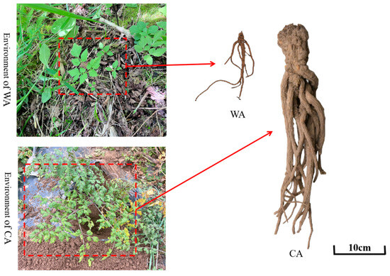 The first year of A. sinensis is the seedling period, the second year is to harvest the fleshy roots, which are to be used as TCM, and the third year is to bolt and bloom for harvesting seeds [12]. The bolting makes the fleshy roots of A. sinensis lignified, which cannot be used as TCM. Therefore, the growth age of the A. sinensis samples selected in this study was two years. The fresh roots of WA (WA-1, WA-2, WA-3) and CA (CA-1, CA-2, CA-3) were collected as experimental materials (Figure 1). Samples were collected from Nanhe Town (2113 m above sea level; 104°18′50.27″ E, 34°08′57.71″ N) in Dangchang County (Dingxi City, Gansu Province, China) in September 2023. They were identified by Professor Jin Ling (Gansu University of Traditional Chinese Medicine, Lanzhou, China). Collected samples were scrubbed and transported, frozen immediately in liquid nitrogen, and stored at −80 °C for MA and TA.