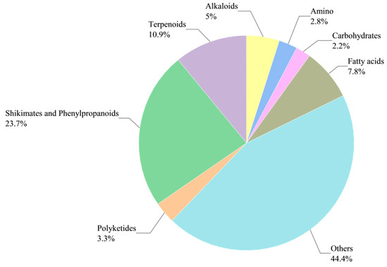 Principal component analysis (PCA) revealed that the PC1 and PC2 values for WA/CA accounted for 42.2% and 18.9%, respectively (Appendix A). The metabolic profiles of WA and CA exhibited distinct spatial separation, indicating significant differences between them. Many compounds were identified by UHPLC-MS. A pie chart can show the proportion of each part of the whole, and different parts can be compared intuitively. A pie chart was drawn for the identified compounds (Figure 2). Compounds with a high proportion were shikimates and phenylpropanoids (23.7%), terpenoids (10.9%), fatty acids (7.8%), alkaloids (5.0%), and polyketides (3.3%).