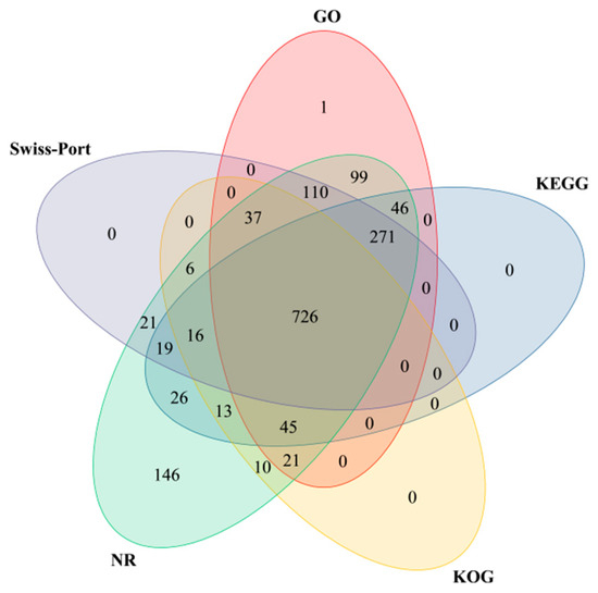 A total of 21,521 DEGs detected were screened. A total of 1837 DEGs with obvious differences were screened and compared with five databases: Gene Ontology (https://geneontology.org/, accessed on 29 March 2024), KEGG, KOG (https://www.kegg.jp/, accessed on 29 March 2024), NR (http://ftp.ncbi.nih.gov/blast/db/, accessed on 29 March 2024), and SWISS-PROT (www.sib.swiss/swiss-prot/, accessed on 29 March 2024). A Venn diagram was drawn (Figure 7). A total of 1356 DEGs were annotated in the GO database, 1162 DEGs in the KEGG database, 874 DEGs in the KOG database, 1612 DEGs in the NR database, and 1206 DEGs in the SWISS-PROT database. A total of 1613 DEGs were annotated, accounting for 87.81% of the total number of DEGs. A total of 726 DEGs were annotated by the five databases, accounting for 39.52% of the total number of DEGs, indicating that only a small fraction of the DEGs can be annotated in the five databases at the same time.