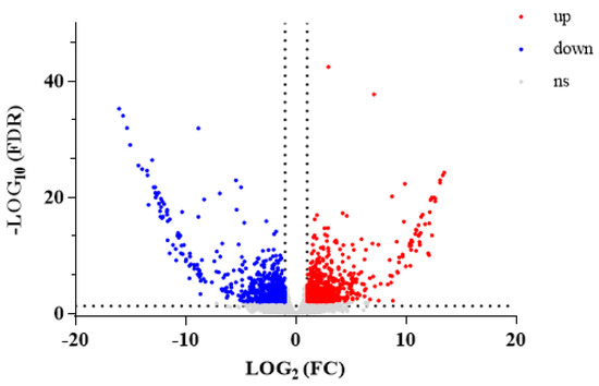 A total of 12,580 metabolites with p < 0.05 were selected from 60,052 DMs. A total of 4919 DMs had upregulated expression and 7661 had downregulated expression in WA compared with CA. A volcano plot visually shows the overall distribution of DMs between the groups (Figure 3).