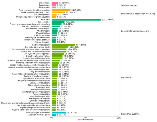 The Kyoto Encyclopedia of Genes and Genomes (KEGG) database (www.genome.jp/kegg/, accessed on 29 March 2024) is the most commonly used database for analyses of the enrichment of pathways [15,16]. Annotation of pathways is shown in Figure 4.