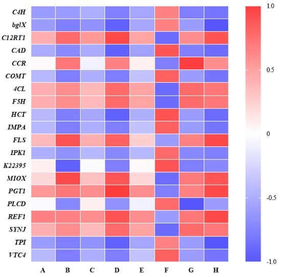 The RELs of genes involved in phenylpropane biosynthesis and flavonoid biosynthesis (** p < 0.05; *** p < 0.001; **** p < 0.0001).