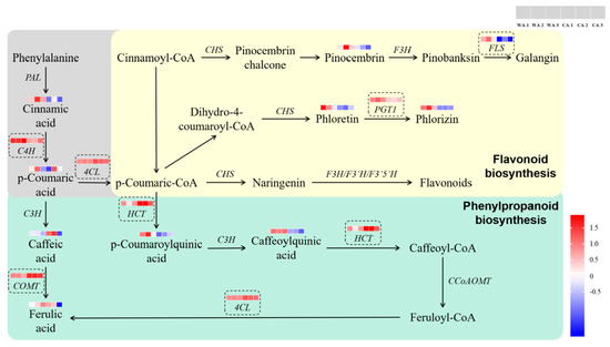 Flavonoids are important chemical components in A. sinensis. Flavonoids have antibacterial, antiviral, antioxidant, and other effects, but also have important roles in the growth, development, and ecological defense of A. sinensis and other plants. Flavonoids affect the color of plants [26], improve resistance to pathogens [27], and improve the tolerance and resistance of a plant to abiotic stress [28,29,30,31], and so on. In terms of “Flavonoid biosynthesis”, expression of C4H, phlorizin synthase (PGT1), and flavonol synthase (FLS) was downregulated significantly, and 4CL expression was upregulated significantly. Expressions of the metabolites cinnamic acid, phloretin, phlorizin, and pinocembrin were downregulated significantly, and expression of the metabolite p-coumaric acid was upregulated significantly (Figure 12). These results showed that C4H, 4CL, PGT1, and FLS may be related to the differences in flavonoid content between WA and CA. Therefore, we speculated that these four genes were also related to the color difference between WA and CA. Studies have found that phlorizin is a common dihydrochalcone compound, which has a slightly sweet taste, and it includes antioxidant, antibacterial, antiviral, antitumor, and other biological activities [32]. The results of DM detection showed that phlorizin expression was downregulated significantly in WA compared with that in CA. These data indicated that phlorizin may lead to differences in some biological activities between WA and CA, and may also be one of the important factors leading to the difference in taste between WA and CA. Studies have reported that galangin is a flavonoid with anti-inflammatory, antibacterial, anti-aging, and anti-hypertensive effects [33]. FLS is located upstream of galangin, and galangin expression was downregulated significantly in WA compared with that in CA. We speculate that FLS is one of the key genes responsible for the difference between some biological activities of WA and CA.
