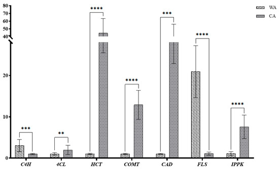 In addition to the nine DMs in Figure 12, there are five significant DMs in “Phenylpropanoid biosynthesis” and “Flavonoid biosynthesis”: 4-hydroxystyrene, p-coumaryl alcohol, sinapic acid, conife rin, and sinapyl alcohol. These five DMs were significantly downregulated in WA vs. CA. CAD is located upstream of p-coumaryl alcohol and sinapic acid, and COMT is located upstream of sinapic acid. It can be speculated that CAD may regulate p-coumaryl alcohol and sinapic acid, and COMT may regulate sinapic acid.