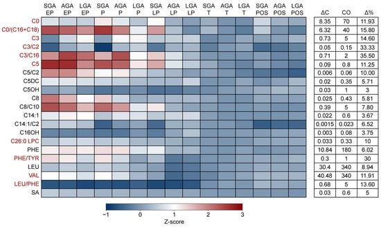 Following stratification, data were normalized by calculating z-scores for each marker by subtracting the study population mean from the group mean and dividing the outcome by the study population standard deviation. (i.e., (average (SGA EP free carnitine)—average (study population free carnitine))/standard deviation (study population free carnitine)). Additionally, we divided the largest observed deviation (ΔC) by the cut-off values currently used in the Dutch NBS (CO) of the respective marker and multiplied this value by 100 (deviation/cut-off value × 100 = Δ%) to determine the relevance of the observed change in concentration. The deviation observed between the population mean and the group that differs most from it is the number selected as the largest observed deviation (ΔC). With regard to the ΔC, a 10% deviation was selected as the threshold to identify meaningful changes in a marker. This approach was taken as small standard deviations (indicating a small spread in the data) may result in large z-scores even though the change in concentration is relatively small. Z-scores for each marker were subsequently depicted in a heatmap. To compare our results to the moving percentiles in CLIR, we utilized the marker versus covariate plot from the productivity tools in CLIR.