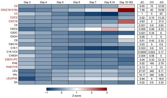 The impact of the age of sampling on markers in the Dutch NBS. Heatmap depicting the concentration (z-score), change in concentration between the group with the lowest and highest mean value (ΔC), cut-off value (CO) and percentual concentration change relative to the cut-off value (Δ%) of NBS markers for different age categories. Markers for which the Δ% was high > 10% are colored red. Z-scores were calculated by subtracting the study population mean from the group mean and dividing the outcome by the study population standard deviation. (i.e., (average (SGA EP C0)—average (study population C0))/standard deviation (study population C0)). The Δ% was calculated by dividing ΔC by the cut-off value (CO) and multiplying the outcome by 100 (ΔC/CO × 100). An overview of the data for each group can be found in Supplementary Table S3.
