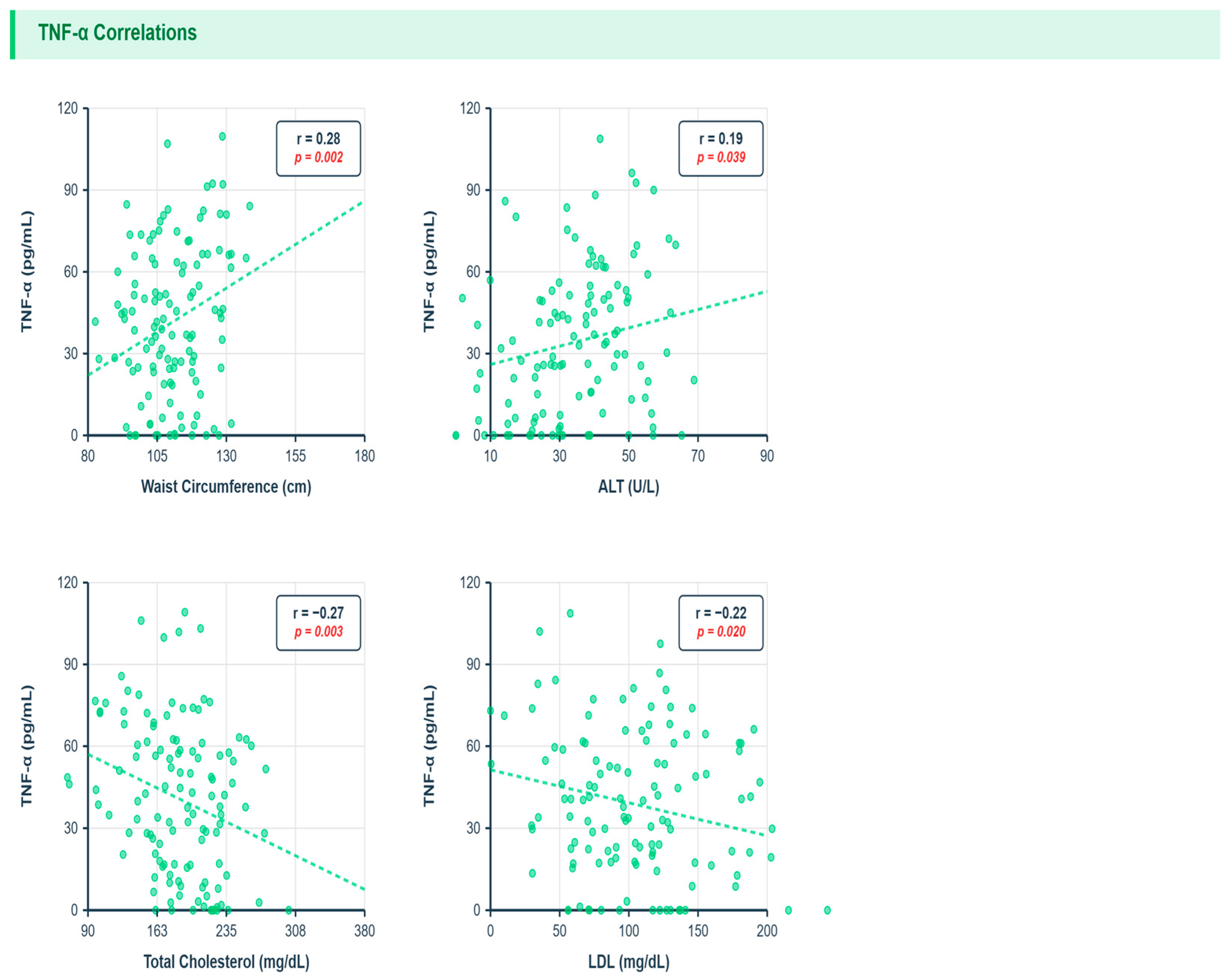 - TNF-α: waist circumference r = 0.28 q = 0.01, ALT r = 0.19 q = 0.04; inverse total cholesterol r = −0.27 q = 0.03, LDL r = −0.22 q = 0.04, triglycerides r = −0.13 q = 0.045 (corrected).