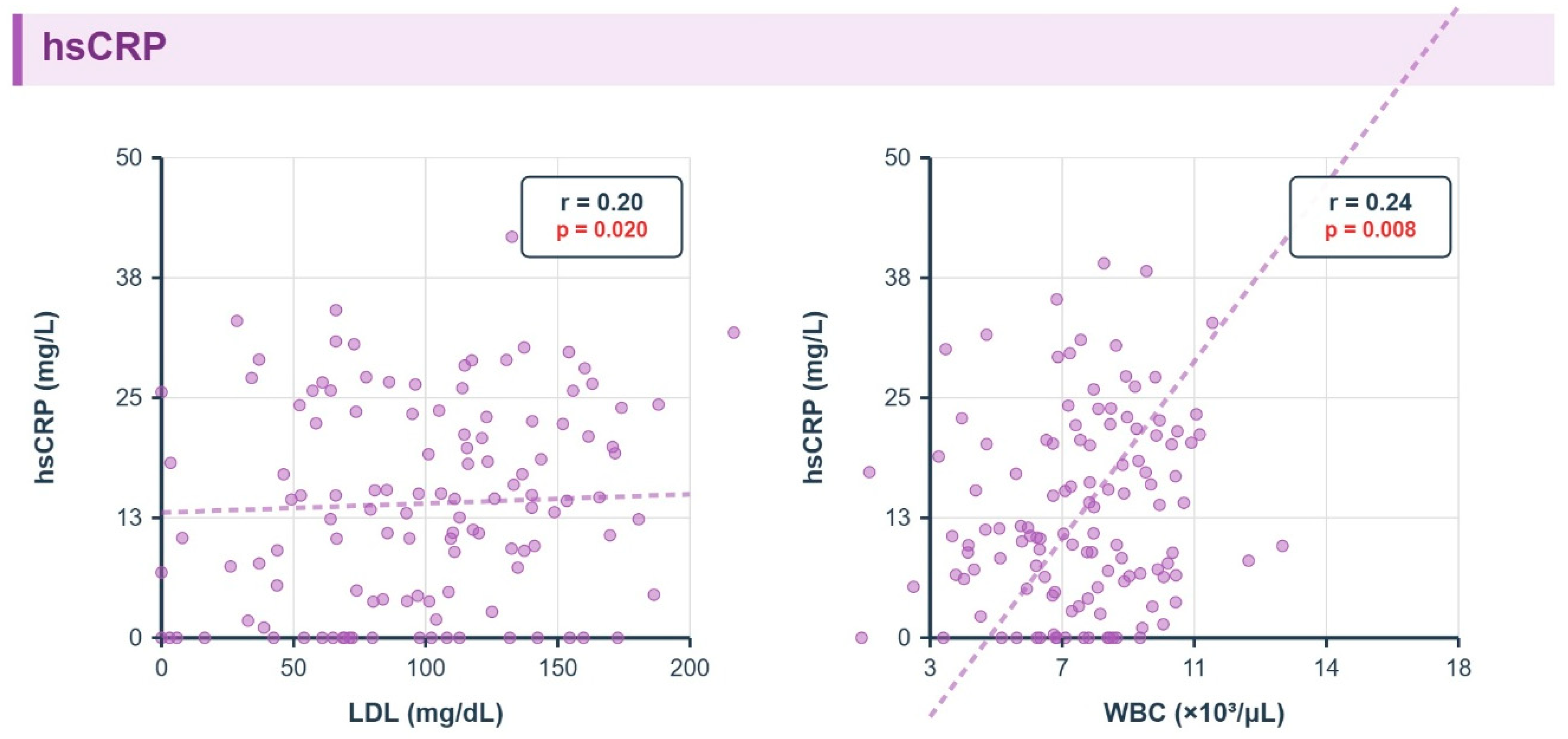 | 2 | hsCRP (mg/L) | LDL (mg/dL) | 0.18 | 0.03 | 0.25 |