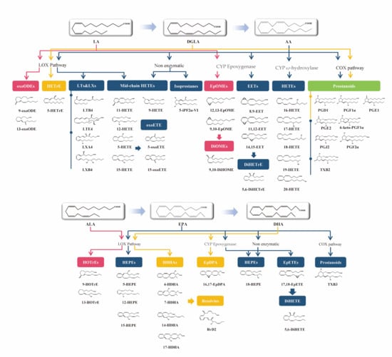 LA-, DGLA-, AA-, ALA-, EPA-, and DHA-derived oxylipins and the main enzymes involved in their generation and breakdown. Arrows of different colors represent distinct pathways.