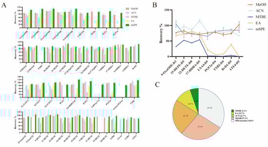 Summary of extraction recoveries obtained for standards spiked (25 ng/mL) in serum samples for each sample preparation protocol. (A) Comparison of extraction recoveries using different extraction methods. (B) Comparison of extraction recoveries of nine ISs using different extraction methods. (C) The extraction recovery rate of different methods ranges from 80% to 120%.