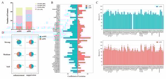 In addition, with regard to the extraction recovery rate (Figure 5C), no significant differences were observed between the two methods. However, a comparison of the MEs (Figure 5D) of the two methods shows that aSPE results for more compounds are within the range of mild enhancement or inhibition (80–120%), indicating that the aSPE method is less affected by the MEs.
