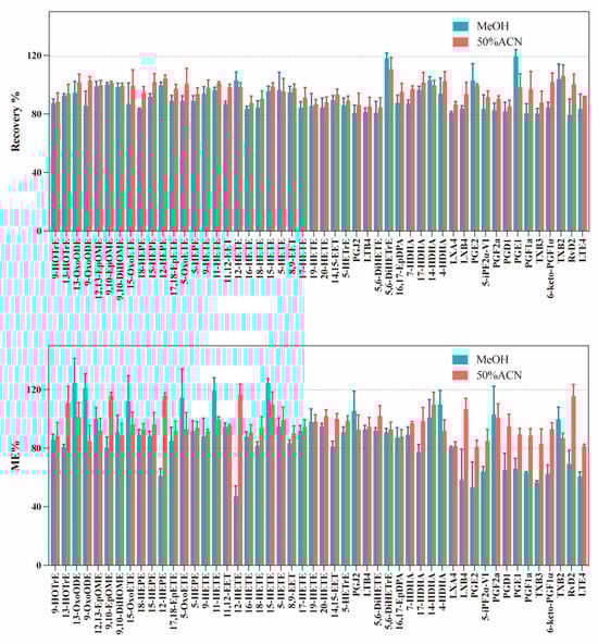 Extraction efficiency was evaluated by comparing protocol recovery rates for fifty reference metabolites and nine internal standards spiked into serum. PPT serves as an effective approach for simultaneous protein removal and lipid extraction from biological specimens. Previous studies [23,28,29] demonstrate that organic solvents including ACN and MeOH efficiently isolate free oxylipins from biological matrices. However, it is important to note that there are significant differences in the efficiency of these solvents for different oxylipin categories. For the HETrE, HEPE, ω-terminal HETE, DiHETE, DiHOME, DiHETrE, and HOTrE, which are advantage oxylipins extracting from MeOH, a high recovery rate was achieved (Figure 4A).