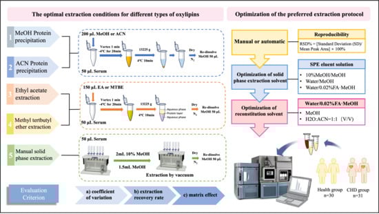 The goal of this work is to propose the adaptability and specificity of oxylipin subtypes based on different single-step extraction schemes and establish a high-throughput quantitative scheme of oxylipins for serum. Firstly, five analytical methods of oxylipin subtypes were investigated, namely the MeOH PPT, ACN PPT, EA LLE, MTBE LLE, and SPE methods. Three key parameters—extraction efficiency, recovery rate, and matrix effects (MEs)—were assessed to identify the most suitable analytical approach for various oxylipin subclasses. For the further development of SPE methods, the performance of manual SPE (mSPE) and automated SPE (aSPE) methods were compared to establish a high-throughput quantitative oxylipins analytical platform of clinical serum. Eventually, a novel sensitive fast aSPE–LC–MS/MS analytical platform was applied to detect serum samples of coronary heart disease (CHD) patients to screen potential oxylipins biomarkers for the diagnosis and treatment of CHD (Figure 1).