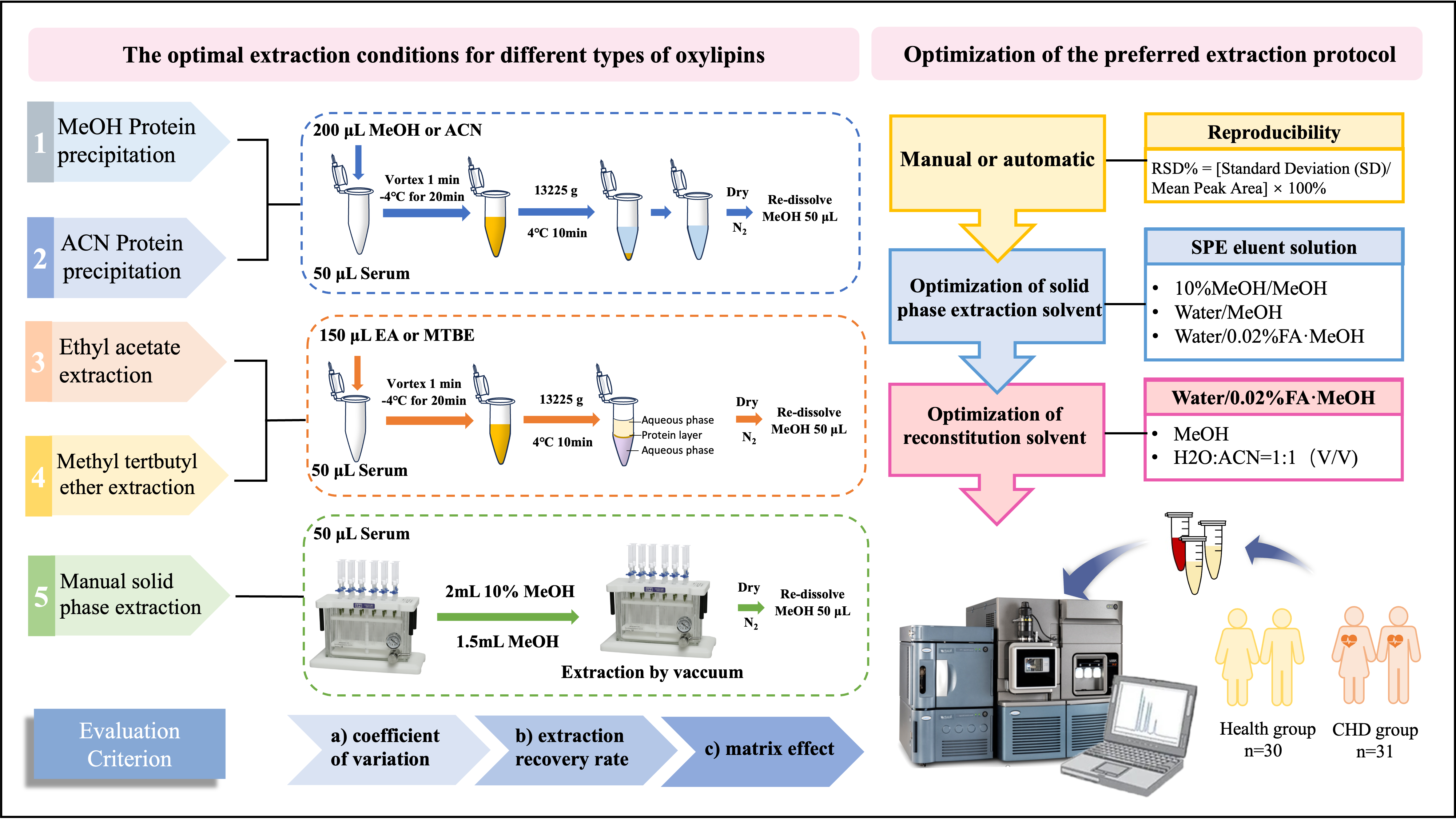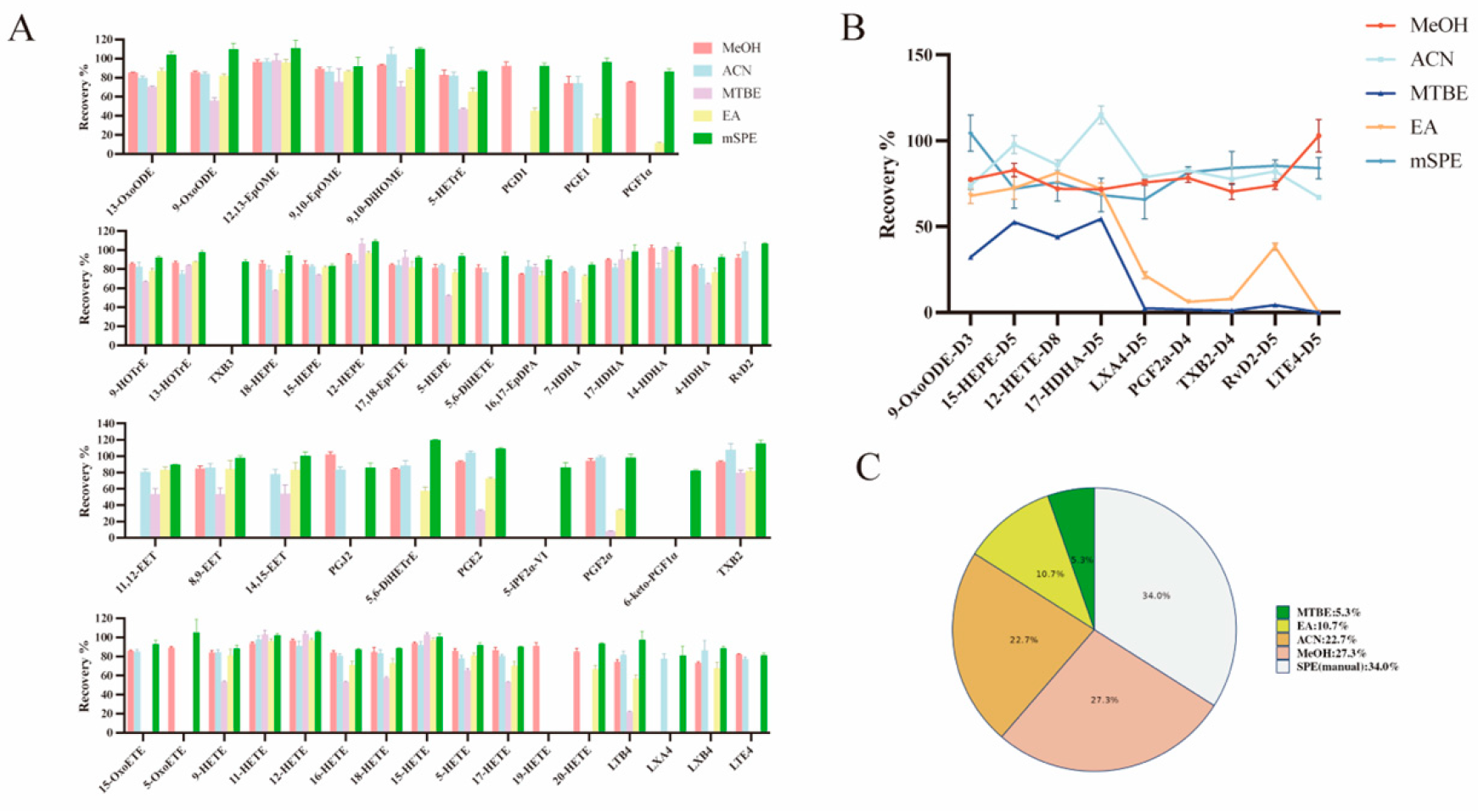 Following the above-described investigation, we further investigated the advantageous extraction protocols of different oxylipins and examined the extraction efficiency, extraction recovery rate, and MEs of the protocols.