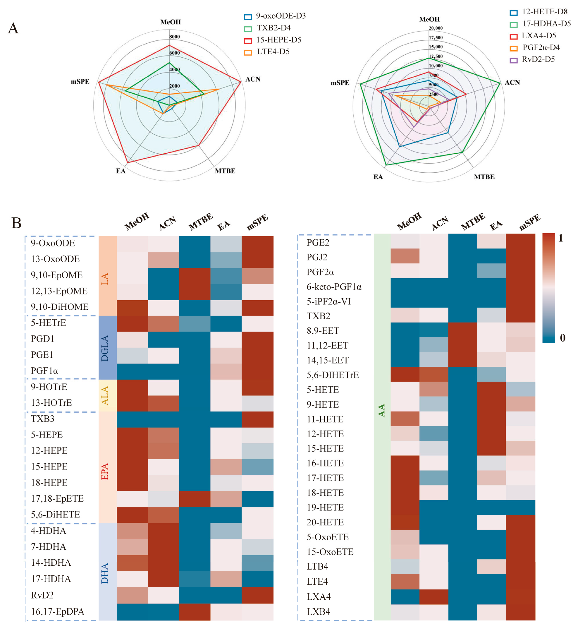 The extraction efficiency of various solvents was initially assessed by comparing IS peak areas. As illustrated in Figure 3A, the evaluation of five extraction methods revealed the superior performance of 12-HETE-D8 when using EA as the extraction solvent. The extraction result of 17-HDHA-D5 performs best under the extraction conditions of ACN, while the extraction result of 15-HEPE-D5 performs best under the extraction conditions of MeOH. By contrast, for LXA4-D5, PGF2 α-D4, and RvD2-D5, the best results were achieved with mSPE as the extraction protocol. The mSPE protocol also showed the best 9-oxoODE-D3 extraction efficiencies, while the ACN and SPE protocols can be considered as the best choice for TXB2-D4. For LTE4-D5, a significant advantage is observed for MeOH and mSPE.