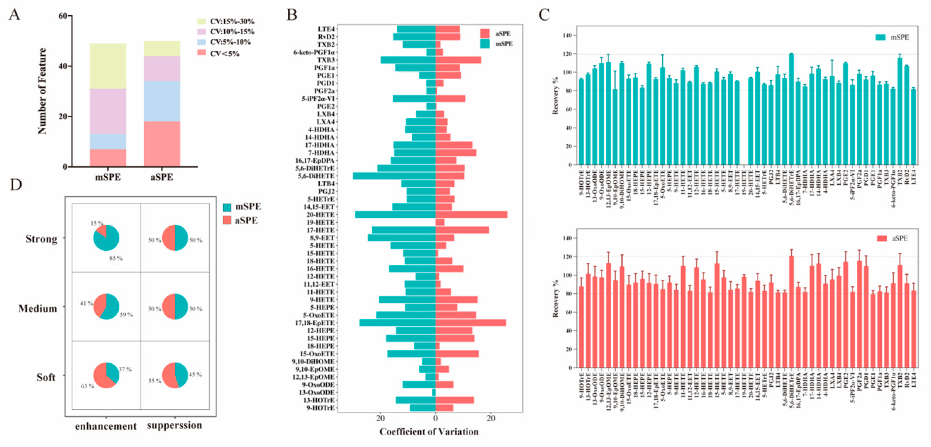 Comparison of mSPE and aSPE. (A) Histograms of detected features in each protocol are used to assess the extraction efficiency. (B) The coefficient of variation (CV%) of peak intensity for 50 compounds detected by both manual and aSPE. (C) Extraction recoveries with mSPE and aSPE. (D) Matrix pie chart of analytes attributed to various MEs.