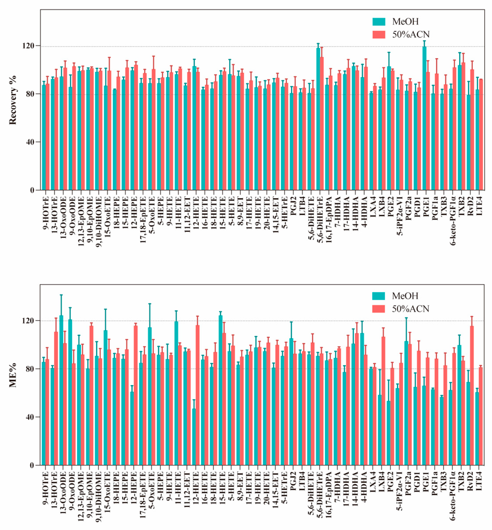 Quantitative reconstitution is crucial for a robust workflow. Therefore, we investigated the effects of different complex solutions on the extraction recovery rate and ME, including MeOH and 50% ACN. As shown in Figure 6, compared to the MeOH protocol, all eicosanoids show close to 100% extraction recoveries in the 50% ACN reconstituting protocol. The same extraction recovery (close to 100%) is also observed for other oxylipins. In addition, the results are quite satisfying and the optimized protocol using 50% ACN does not exhibit significantly stronger MEs than MeOH. To conclude, the optimized protocol with 50% ACN can achieve the best results for all oxylipins classes including the eicosanoids. Furthermore, compared with pure MeOH, the use of 50% ACN as the reconstitution solvent not only improves the extraction recovery of oxylipins but also achieves better injection precision (with lower CV values) (Figure S4). This is likely attributable to its lower volatility and enhanced sample stability in the autosampler.