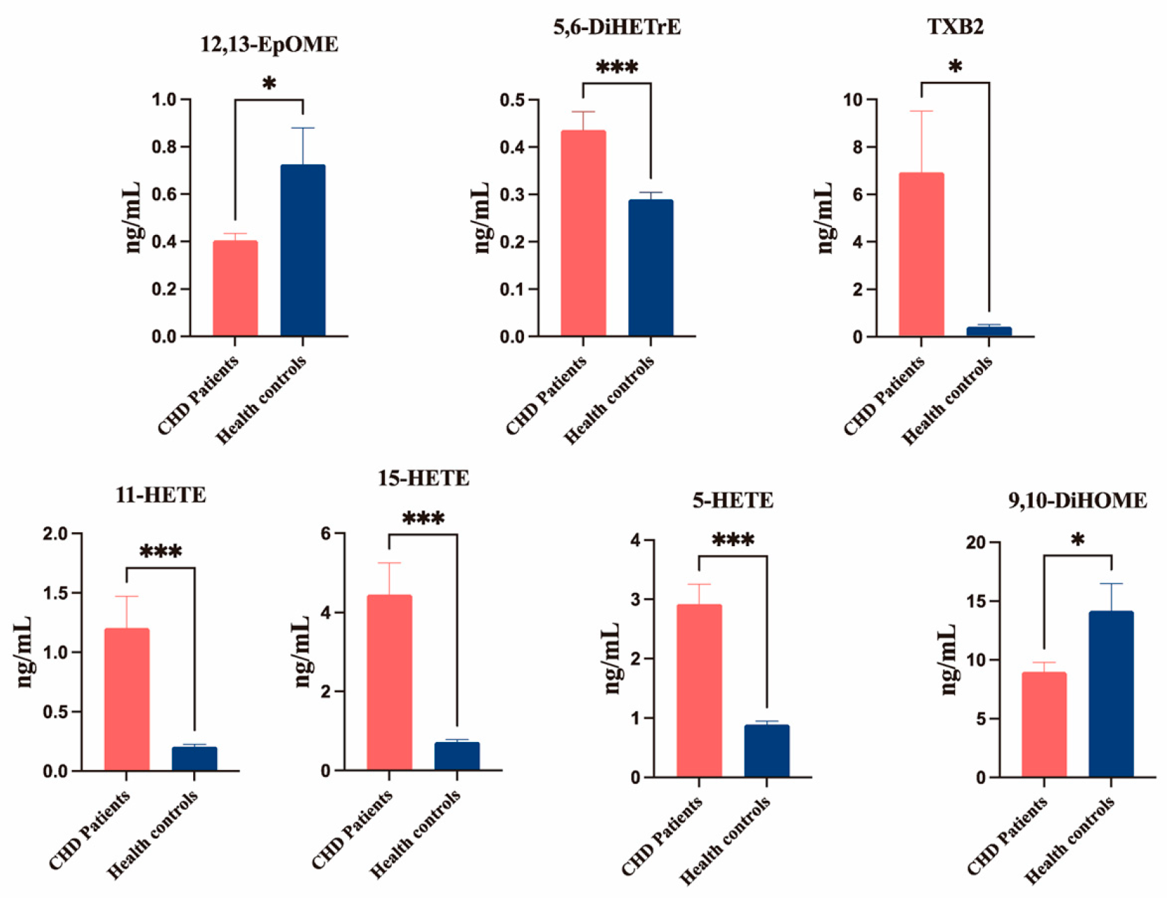 Serum oxylipins concentrations in the CHD and healthy control groups, as measured by UPLC–MS/MS. Data are means ± SEM. Results were compared using Student’s t-tests. n = 30–31 per group. * p < 0.05 and *** p < 0.001 vs. CHD group. p-value corrected by Bonferroni.