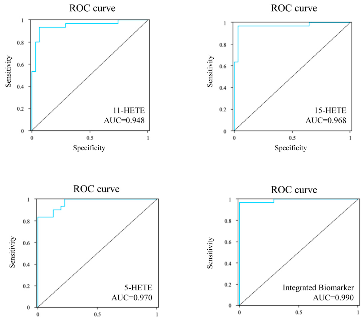 ROC curves of the 11-HETE, 15-HETE, 5-HETE, and the integrated biomarker for predicting the CHD.