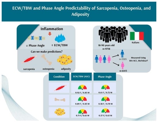- Harimawan, A.I.W.; Prabandari, A.A.S.M.; Wihandani, D.M.; Jawi, I.M.; Weta, I.W.; Senapathi, T.G.A.; Dewi, N.N.A.; Sundari, L.P.R.; Ryalino, C. Association between phase angle and ECW/TBW ratio with body composition in individuals with central obesity: A cross-sectional study. Front. Nutr. 2025, 12, 1638075. [Google Scholar] [CrossRef]