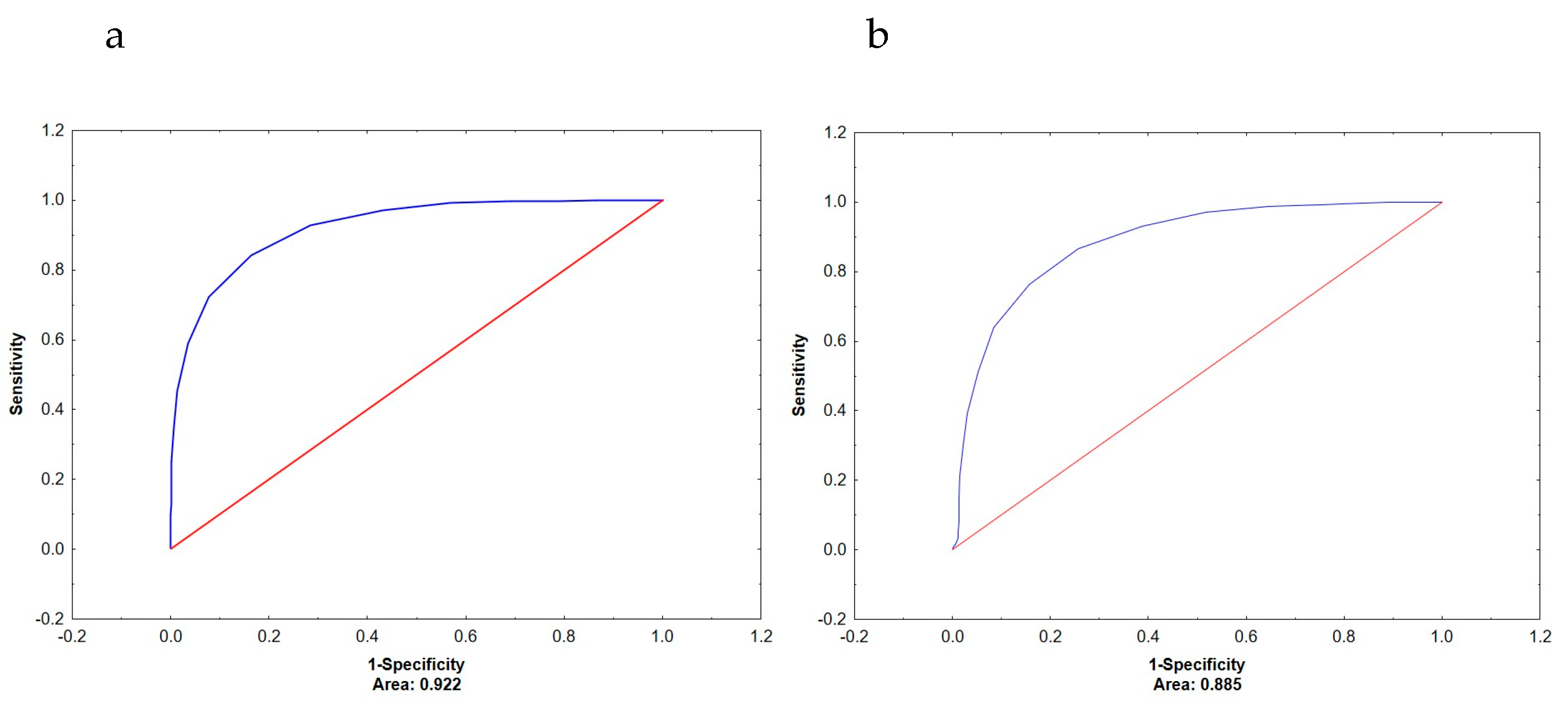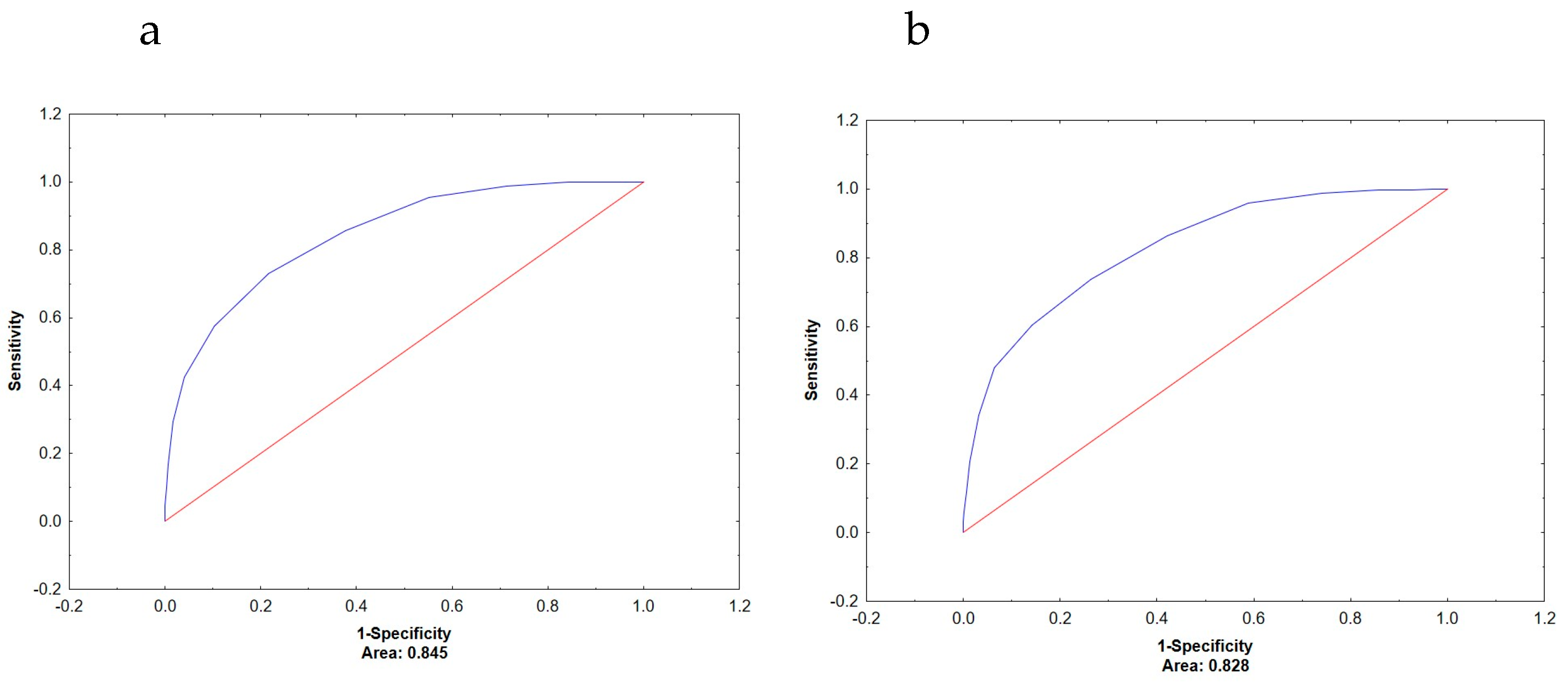 - Hanley, J.A.; McNeil, B.J. A method of comparing the areas under receiver operating characteristic curves derived from the same cases. Radiology 1983, 148, 839–843. [Google Scholar] [CrossRef]