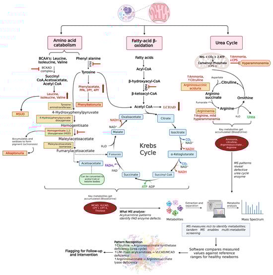 Figure 3 highlights key metabolic pathways affected by inborn errors of metabolism, including amino acid catabolism, fatty acid beta-oxidation, and the urea cycle, which all influence the TCA cycle. Enzyme malfunctions in these pathways lead to the accumulation of harmful substances, resulting in metabolic disorders in newborns.